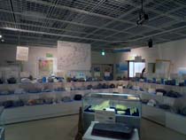 | 葛生化石館の半分のエリアは 石灰についての展示。 ここに並んでいるのは全国各地 の「石灰石」。いろんな色がある のはなんとなくわかりますか?? |