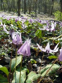 | カタクリの群生地。 ひそかに傍らにニリンソウなどの 山野草も一緒に見られます。 |